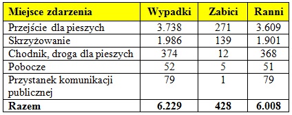 W 2018 r. w wypadkach zginęło w Polsce w sumie 803 pieszych. Jedyna publiczna informacja o miejscach tych wypadków to roczny raport Komendy Głównej Policji. Dokument za 2018 r. wyróżnia pięć miejsc udostępnionych dla ruchu pieszego, w których odnotowano 6229 wypadków i w sumie 428 ofiar.