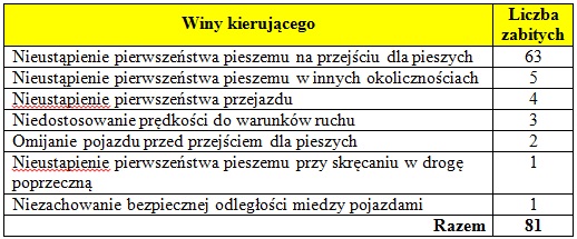 Piesi – sprawcy śmiertelnego potrącenia najczęściej giną wchodząc nieostrożnie na jezdnię przed nadjeżdżającym pojazdem. W 14-tu przypadkach piesi zginęli wchodząc na jezdnie (przejście dla pieszych) przy czerwonym świetle.