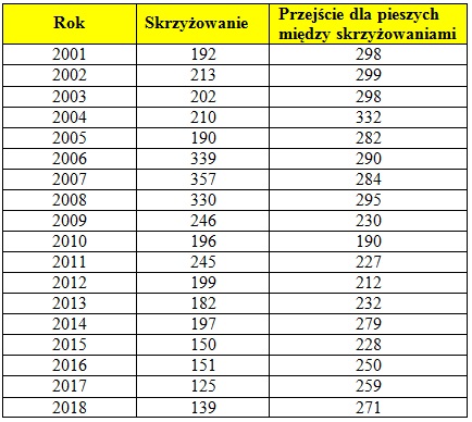Biorąc pod uwagę dwie najliczniejsze grupy wypadków z pieszymi w miejscach dla nich udostępnionych, warto przyjrzeć się historii śmiertelnych zdarzeń na skrzyżowaniach i na przejściach dla pieszych (miedzy skrzyżowaniami). Z poniższej tabeli wynika, ze w pierwszym przypadku nastąpił długofalowy progres. Natomiast jeśli chodzi o zdarzenia ze skutkiem śmiertelnym na przejściach dla pieszych miedzy skrzyżowaniami, to pozytywne zmiany skończyły się w 2010 r.