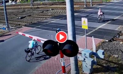 PKP ujawniła nagranie z przejazdu kolejowego w Dęblinie. Rowerzystka, która zignorowała sygnały i opadające rogatki, sama się ukarała – uderzyła się w głowę i spadła z...