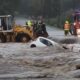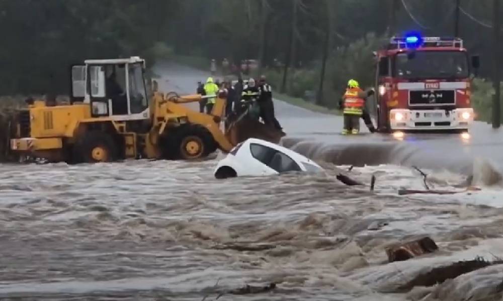 Kobieta próbowała przejechać przez zalaną drogę w Kałkowie. Jej auto porwała rzeka. Strażacy wyjęli ją z pojazdu przez okno tuż przed tym, jak auto zatonęło Do...