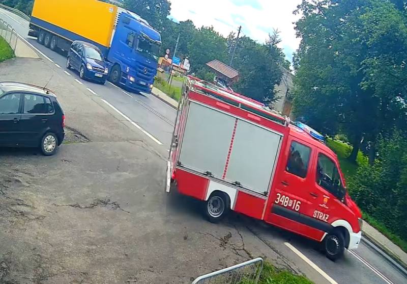 Strażacy z OSP w Łężanach pokazali nagranie. Wyjeżdżali spod remizy do akcji, a kierowca ciężarówki jechał jak ślepy i ratował się przed staranowaniem innego auta wjazdem...