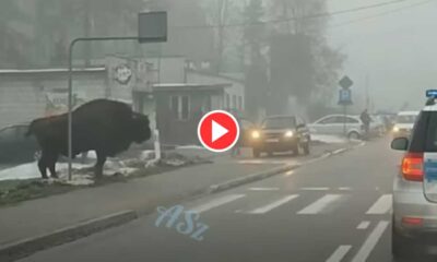 W wigilię w Hajnówce przez przejście dla pieszych zamierzał przejść… żubr. Zrezygnował, gdy podjechała na sygnałach policja W wigilię Bożego Narodzenia w Hajnówce żubr przechadzał się...