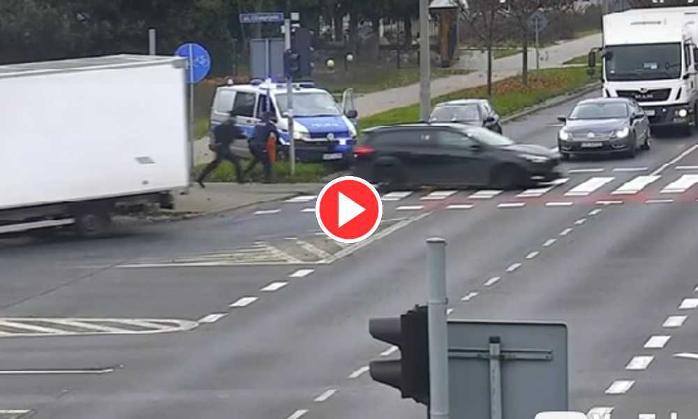 Kierowca pokazał, jak policjanci jechali przed przejściem, przy którym stała piesza. Czy powinni ją zauważyć? Nowe przepisy nakazują kierowcy ustąpić pieszemu, który nawet jeszcze nie wszedł...