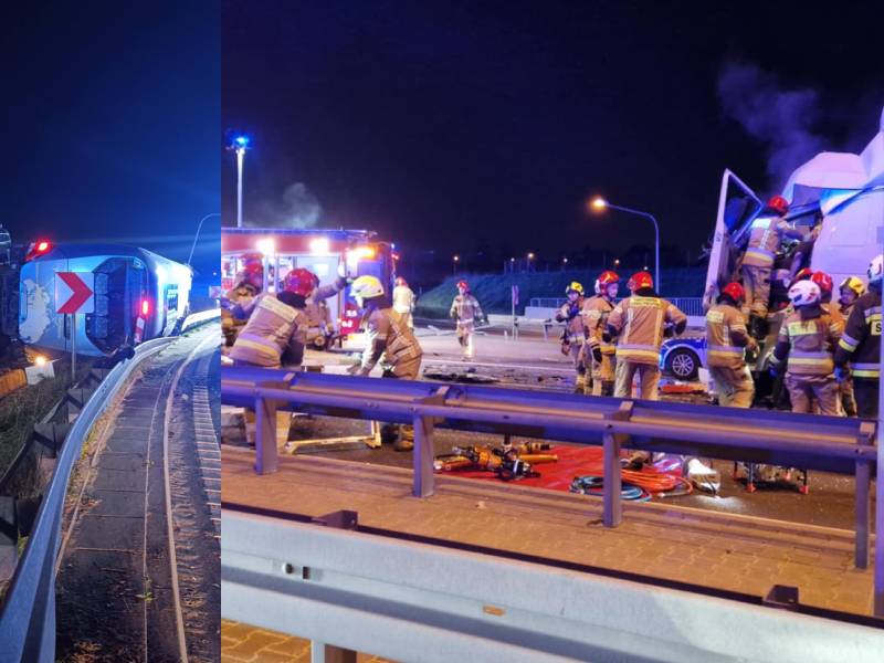 Dramatyczna noc na trasie S2 koło Warszawy. Najpierw kierowca autobusu wywrócił pojazd. Potem na wóz niosących pomoc strażaków najechał kierowca ciężarówki. Jest wielu rannych Na trasie...