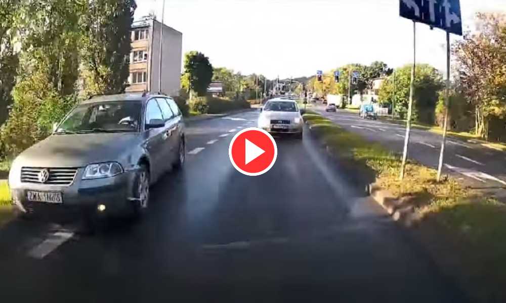 Kończący się pas, ale kierowca volkswagena chce jechać szybciej niż dopuszczalna prędkość i wyprzedzić z prawej strony. Pokonał go krawężnik Od zmiany prawa i wprowadzeniu w...